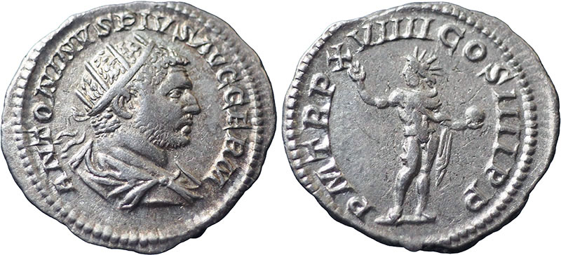CARACALLA. 198-217 AD. Ar Antoninianus. P M TR P XVIIII COS IIII P P. Sol radiate, standing front, head left, raising right hand and holding globe. RSC 358a. |