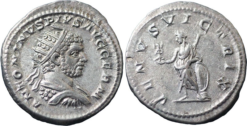 CARACALLA. 198-217 AD. Ar Antoninianus. VENVS VICTRIX. Venus standing half-left, holding Victory and sceptre and leaning on shield set on helmet. RSC 608a. |