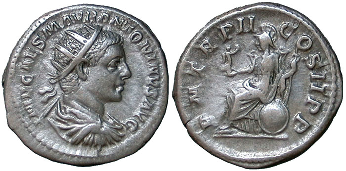 ELAGABALUS. 218-222 AD. Ar Antoninianus. P M TR P II COS II P P. Roma seated left on throne, holding Victory and sceptre, shield at side. RSC 139. |