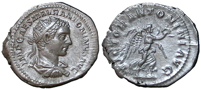 ELAGABALUS. 218-222 AD. Ar Antoninianus. VICTOR ANTONINI AVG. Victory running right, holding wreath and palm over left shoulder. RSC 291. |