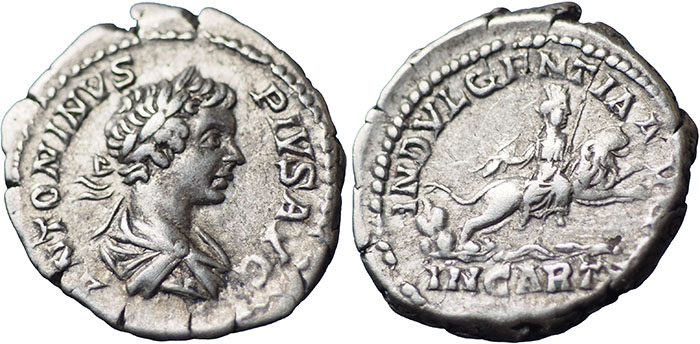 CARACALLA. 198-217 AD. Ar Denarius. INDVLGENTIA AVGG around IN CARTH in exergue. Dea Caelestis, holding thunderbolt and sceptre, seated facing, head right, on lion running right over water gushing from rock. RSC 97. |
