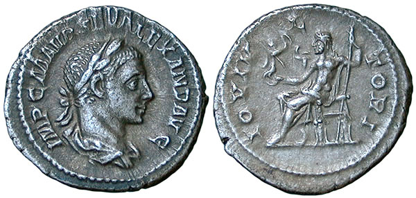SEVERUS ALEXANDER. 222-235 AD. Ar Denarius. IOVI VLTORI. Jupiter, half-naked, seated left on throne, holding Victory and sceptre. RSC 95. Toned. |