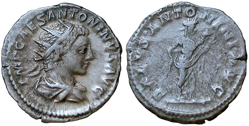 ELAGABALUS. 218-222 AD. Ar Antoninianus. SALVS ANTONINI AVG. Salus standing half-right, holding snake across body and feeding it with cake. RSC 255. |