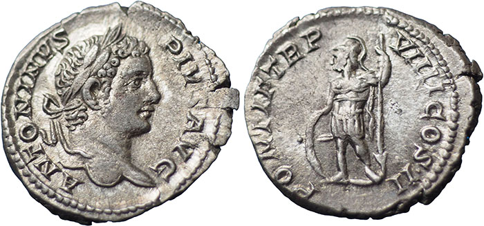 CARACALLA. 198-217 AD. Ar Denarius. PONTIF TR P VIIII COS II. Mars, in military dress, standing half-left, leaning on shield and holding spear reversed. RSC 424. |