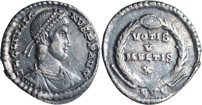 JULIAN. 360-363 AD. Ar Siliqua. DN CL IVLIANVS PF AVG, pearl-diademed, draped and cuirassed bust right. ® VOT V MVLT X, legend in four lines within laurel wreath. Mintmark LVG (Lugdunum). RSC 142a. 17mm. |