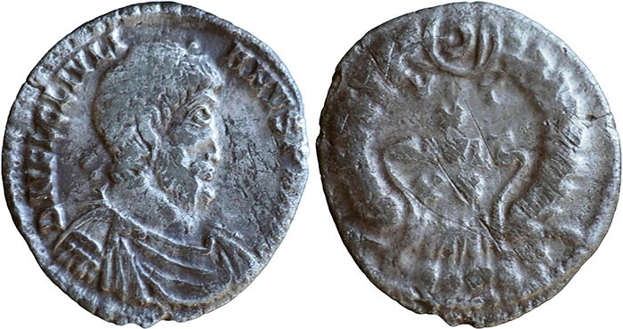 JULIAN. 360-363 AD. Ar Siliqua. DN FL CL IVLIANVS PF AVG, pearl-diademed, draped and cuirassed bust right. ® VOT X MVLT XX, legend in four lines within laurel wreath. Mintmark PCONST (Arelate). RSC 148e. 17mm. |