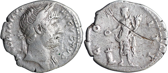 HADRIAN. 117-138 AD. Ar Denarius. COS III. Genius, naked to waist, standing left, holding cornucopiae and sacrificing with patera over altar. RSC 335. UK find. |