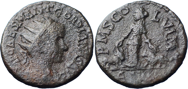 GORDIAN III. MOESIA, Viminacium. Æ 22 mm (8.1 g). IMP CAES M ANT GORDIANVS AVG, radiate bust right. ® PMS CO-LVIM, Moesia standing facing, head left, extending hands to bull and lion standing at feet on either side. |
