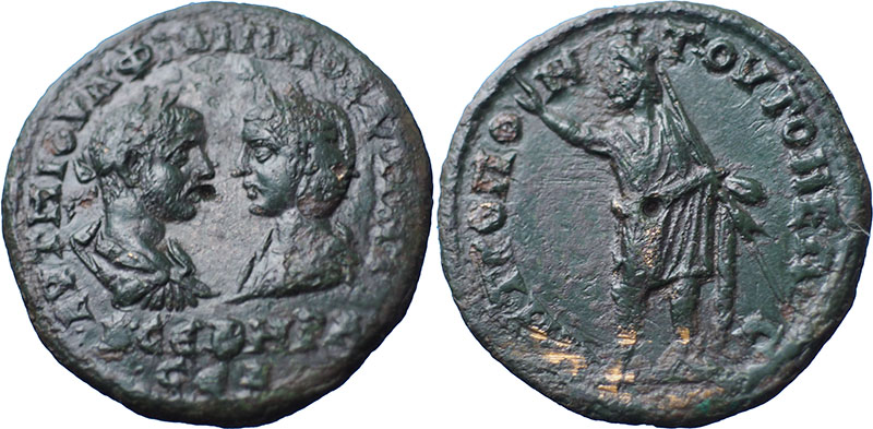 PHILIP I & OTACILIA SEVERA. MOESIA INFERIOR, Tomis. Æ 26 mm (12.3 g). Bust of Philip I right facing bust of Otacilia Severa left. ® Serapis standing facing, head left, holding sceptre and raising right hand. RPC VIII Online 28164. |