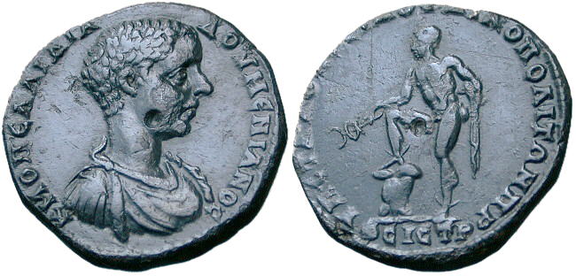 DIADUMENIAN. MOESIA, Nicopolis ad Istrum. Æ 26 mm (11.3 gm). Hermes, naked except drapery, standing left, holding Kerykeion and resting right leg on cuirass. |