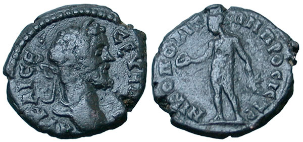 SEPTIMIUS SEVERUS. MOESIA, Nicopolis ad Istrum. Æ 17 mm (3.5 g). Laureate head right. ® Apollo standing left, holding phiale and branch. Varbanov 2548. |