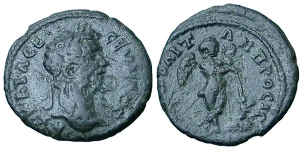 SEPTIMIUS SEVERUS. MOESIA, Nicopolis ad Istrum. Æ 17 mm (2.5 g). Laureate head right. ® Thanatos standing cross-legged and leaning right on inverted torch set on altar. |