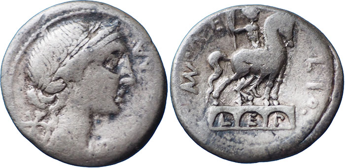 AEMILIA 7. BC 114/113. Ar Denarius. Man. Aemilius Lepidus. Laureate and diademed head of Roma slightly draped right, ROMA before, * behind. ® MN AEMILIO, esquetrian statue on triumphal arch, LEP between the arches. |