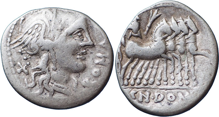 DOMITIA 7. BC 116-115. Ar Denarius. Cn. Domitius Ahenobarbus. Head of Roma right, X behind, ROMA before. ® Jupiter in walking quadriga right, CN. DOMI in exergue. |