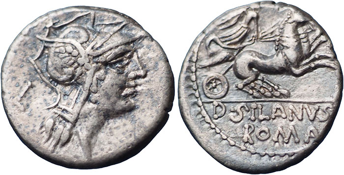 JUNIA 16. BC 91. Ar Denarius. D. Silanus L. f. Head of Roma right, letter behind. ® Victory in biga right, number above, D. SILANVS / ROMA in exergue. |