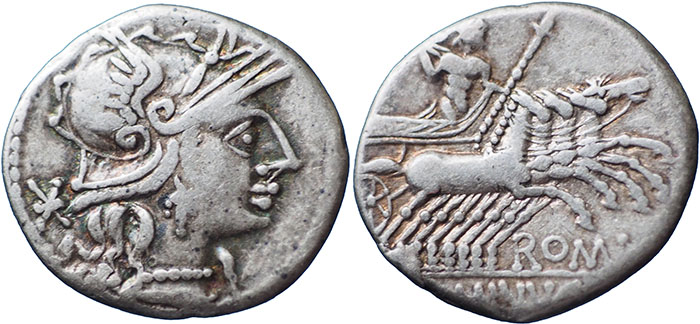 MINUCIA 15. BC 133. Ar Denarius. L. Minucius. Head of Roma right, * behind. ® Jupiter in quadriga right, ROMA below horses, L. MINVCI in exergue. |