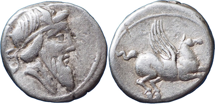 TITIA 1. BC 90. Ar Denarius. Q. Titius. Head of Mutinus Titinus right, bound with winged diadem. ® Q. TITI on tablet from which springs Pegasus right. The god Mutinus Titinus is the same as Priapus, who had a temple at Rome, and who was especially worshipped by young married women. |