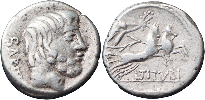 TITURIA 6. BC 89. Ar Denarius. L. Titurius L. f. Sabinus. Head of Tatius right, SABIN behind. ® Victory in biga right, holding wreath, L. TITVRI below horses. |