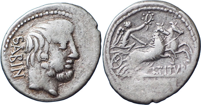 TITURIA 6. BC 89. Ar Denarius. L. Titurius L. f. Sabinus. Head of Tatius right, SABIN behind. ® Victory in biga right, holding wreath, L. TITVRI below horses. |