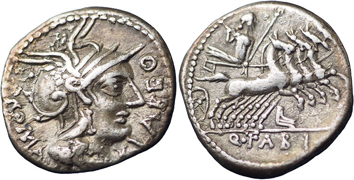 FABIA 1. BC 124. Ar Denarius. Q. Fabius Labeo. Head of Roma right, LABEO before, X under chin, ROMA behind. ® Jupiter in quadriga right, prow below horses, Q. FABI in exergue. The reverse commemorates the naval victories of an ancestor, of the same name, against Antiochus the Great of Syria. |