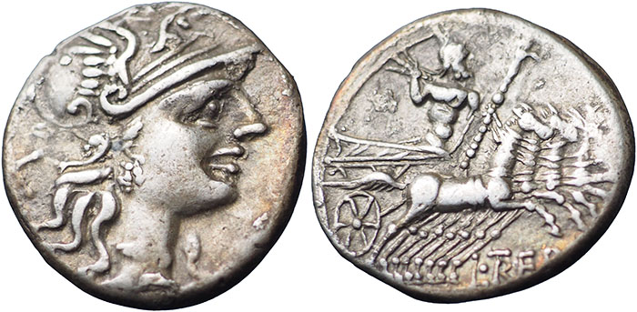 TREBANIA 1. BC 135. Ar Denarius. L. Trebanius. Head of Roma right, X behind. ® Jupiter in quadriga right, L. TREBANI below horses, ROMA in exergue. |