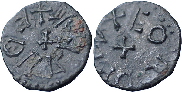 AETHELRED II. 841-849/50 AD. Æ Styca. Phase II: group Ciii. + EDILRED R around small cross. ® + EORDRED (Fordred) around small cross. Spink # 865. Pirie, Coins of the Kingdom of Northumbria No 1655 (same reverse die). 13 mm. |