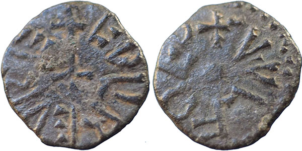 AETHELRED II. 841-849/50 AD. Æ Styca. Phase II: group Ciii. EDLIRED REX around small cross. ® + VVLFRED (Uulfred) around small pellet. Spink # 865. Pirie, Coins of the Kingdom of Northumbria No 1713 (same dies). 12 mm. |