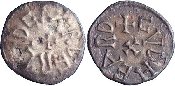 Second reign 789-796 AD. Ar Sceat. Phase Ia. + AEDILRED R (bar above the final R) around small cross. ® + CVDHEARD (Cudheard) around small cross. 0.9g. Spink # 856. Same obverse die as EMC number 1986.5015. Note the bar above the final R for Rex. Cudheard is the only moneyer known to strike coins for Eardwulf (796-806 AD). He uses the same technique of the bar above the final R for this coinage as well. |