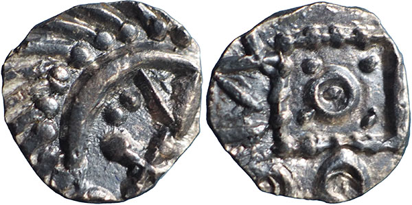 CONTINENTAL. 695-740 AD. Silver (Ar) Sceat. Series E variety D. ‘Porcupine’ right. ® Standard type with four pellets inside a square, symbols in margin. 1.0 g. Spink # 790B. Metcalf p. 219. Attractive piece with good metal, as struck. |