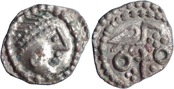 SECONDARY. 710-760 AD. Ae/Ar Plated Sceat. Series J ('York'), type 85. Large diadem head right. ® Bird on a cross with large annulet at the end of each arm, pellets in field. 1.1 g. Spink # 802. Met 293-5. Abramson Sceatta List 18/20. Good weight and a good example of a plated type 85 with most of the silver surface intact. |