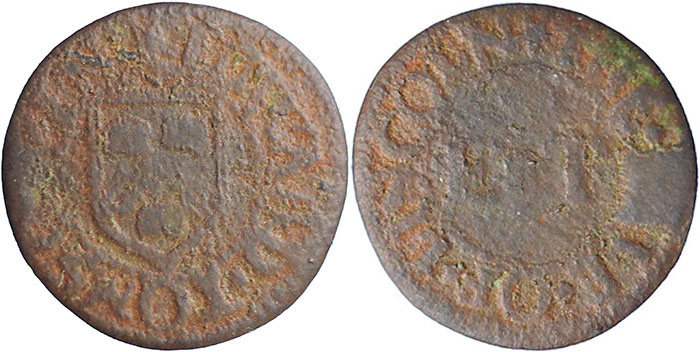 LINCOLNSHIRE. Lincoln. 17th Century Token. Farthing. EDWARD TOMSON IN, ironmonger's Arms. ® THE BALE OF LINCOLN, around E (rosette) T. Dickinson # 169. |
