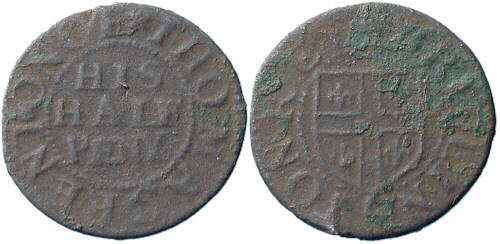 YORKSHIRE. Bridlington. 17th Century Token. * THOMAS FENTON OF. HIS/ HALF/ PENY. ® * BRIDLINGTON KEY. Family arms. Dickinson # 52. |