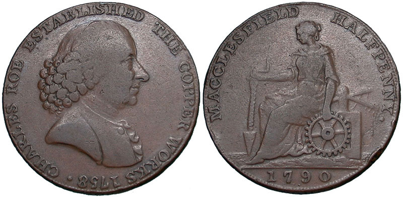 CHESHIRE. Macclesfield. 18th Century Token. CHARLES ROE ESTABLISHED THE COPPER WORKS 1758., bust of Charles Roe. ® MACCLESFIELD HALFPENNY 1790, a female holding a cogwheel with six spokes. Edge: PAYABLE AT MACCLESFIELD LIVERPOOL OR CONGLETON .x. D&H # 25. |
