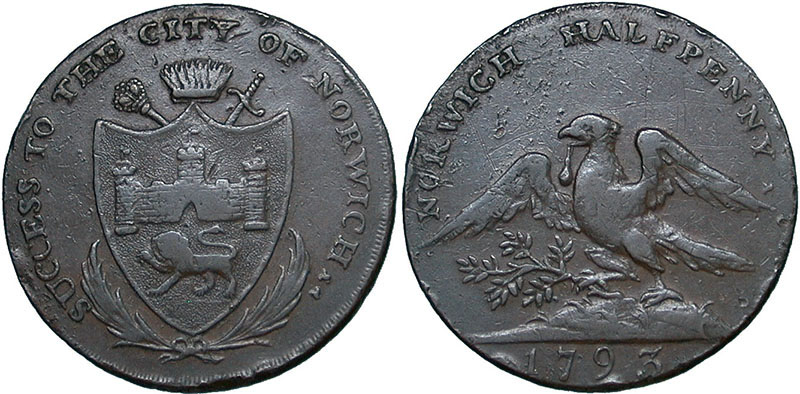 NORFOLK. Norwich. 18th Century Token. Shield of arms of the city of Norwich, upon a sword and mace in saltire, between palm branches. SUCCESS TO THE CITY OF NORWICH. ® An eagle with wings expanded. NORWICH HALFPENNY. 1793. Edge: PAYABLE AT THE SHOP OF DUNHAM & YALLOP GOLD-SMITHS. D&H # 31. |