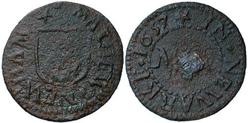 NOTTINGHAMSHIRE. Newark. 17th Century Token. * MATHEW NEWHAM. Mercers arms. ® * IN NEWARKE 1657. M N in centre. Dickinson # 40. |
