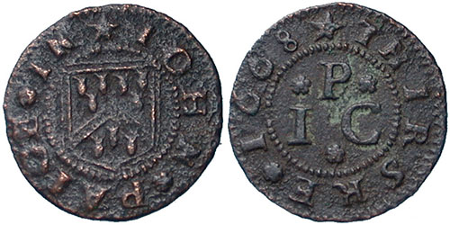 YORKSHIRE. Thirsk. 17th Century Token. * IOHN * PAIGE * IN *. Grocer's Arms. ® * THIRSKE * 1668. * P* / I C *. Dickinson # 351. |