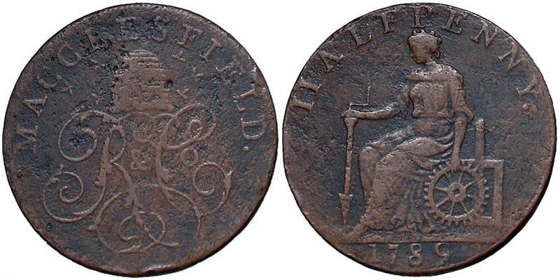 CHESHIRE. Macclesfield. 18th Century Token. MACCLESFIELD. Ornamental cypher of “R & Co” (Roe & Company), surmounted by a beehive and bees. ® HALFPENNY. 1789. Seated female “Genius” holding in her right hand a drill, and a cogwheel of eight spokes in her left. Edge: PAYABLE AT MACCLESFIELD LIVERPOOL OR CONGLETON .x. D&H # 13. |