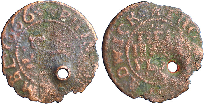 YORKSHIRE. Leeds. 17th Century Token. PHINEAS LAMBE 1666, around a lion couchant. ® THOMAS HARDWICKE, around THEIR HALF PENY in three lines. Dickinson uncertain # 49. See Yorkshire Re-attributions of Seventeenth Century Tokens; Robert H Thompson; Yorkshire Numismatist, vol 3, page 108. Pierced at 5 o'clock. |