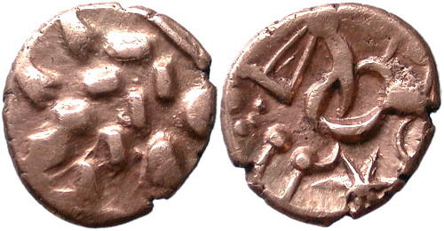 DRIFF 02 | SOUTH FERRIBY. Au Stater. Wreath Pattern. ® Anchor with pellets above horse facing left, sunflower under nose and star below. S 390. Van Arsdell: 811. This coin CCI 04.0837. Comments by Dr. Philip de Jersey: Most of the South Ferriby staters in the CCI are not divided according to more precise VA numbers. However, as Dr. John Sills has just done the work on identifying dies of these types, we can get a bit further. This seems to be the second example of this reverse die, but there are at least twenty or so coins struck from this obverse. |