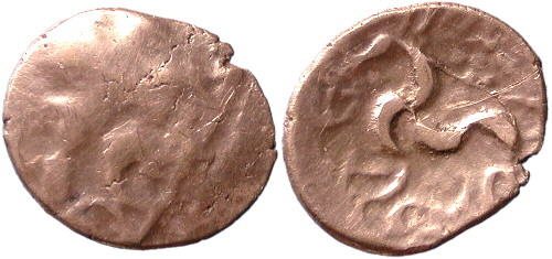 DRIFF 08 | KITE TYPE. Au Stater. Obliterated die. ® Kite shaped object with four pellets above horse left, wheel in front and spiral below. S 392. Van Arsdell: 825-1. This coin CCI 04.0843. Struck from worn dies. Comments by Dr. Philip de Jersey: Obverse as DRIFF07, reverse on seven others. |