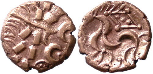 DRIFF 11 | KITE TYPE. Au Stater. Wreath Pattern with wheel. ® Kite shaped object with three pellets above horse left, wheel in front and spiral below. S 392. Van Arsdell: 825-8. This coin CCI 04.0846. Comments by Dr. Philip de Jersey: As DRIFF10. |