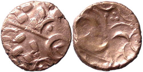 DRIFF 13 | KITE TYPE. Au Stater. Wreath Pattern with wheel. ® Kite shaped object with four pellets above horse left. S 392. Van Arsdell: 825-9. This coin CCI 04.0848. Comments by Dr. Philip de Jersey: Two others this pair of dies; reverse also occurs in combination with another obverse. |