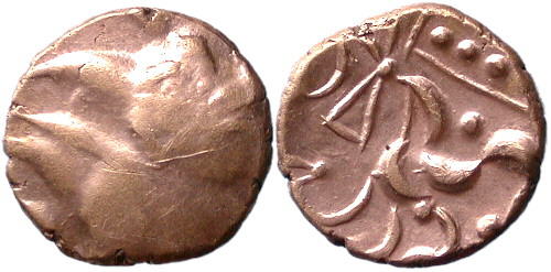 DRIFF 15 | DOMINO TYPE. Au Stater. Vestiges of wreath Pattern. ® Horse left, domino with four pellets above, crescent in front, pellets in field and four pointed wavy armed star below. S 393. Van Arsdell: 829-3. This coin CCI 04.0850. Comments by Dr. Philip de Jersey: Obverse used throughout type. Four others with this reverse die, which Dr. John Sills suggests is recut of die used for coin DRIFF03. |