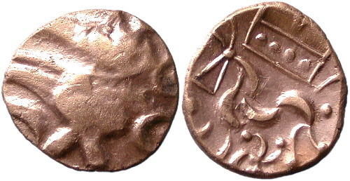 DRIFF 17 | DOMINO TYPE. Au Stater. Vestiges of wreath Pattern. ® Horse left, four pointed wavy armed star below, domino with four pellets above and pellet below tail. S 393. Van Arsdell: 829-3. This coin CCI 04.0852. Comments by Dr. Philip de Jersey: As DRIFF03. |
