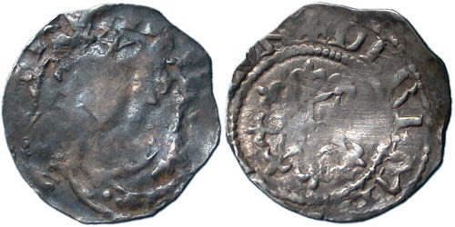 HENRY I. 1100-1135. Penny. Quadrilateral on Cross Fleury type, BMC Type XV. Dereman of London. Bust facing crowned and diademed, head three-quarters left, sceptre in right hand. ® Quadrilateral with incurved sides and lis at each angle over cross fleury. 1.42g. Spink # 1276. North 871. Ex 'Knaresborough Area Hoard'. As struck and good silver. |