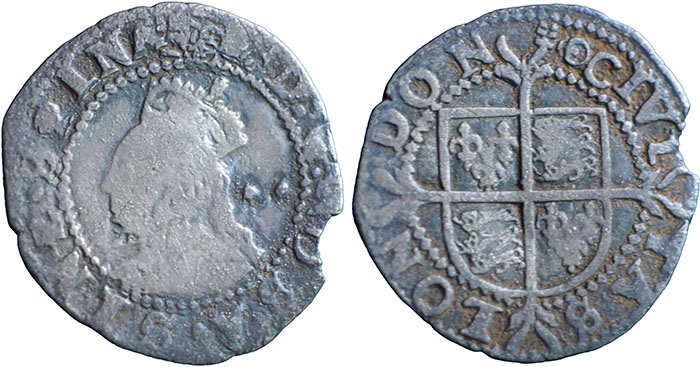 ELIZABETH I. 1558-1603. Halfgroat. Sixth issue (1582-1600). Without rose or date, two pellets behind bust. ® CIVITAS LONDON. mm Key. Spink # 2579.