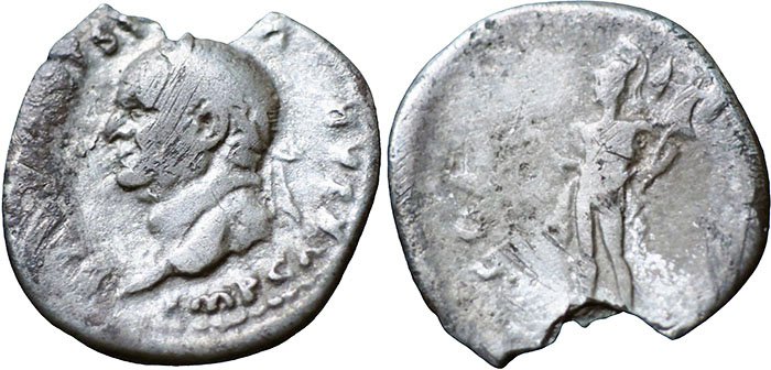VESPASIAN. 69-79 AD. Silver Denarius (19mm). COS VIII. Mars standing left, holding trophy and spear. Chipped flan.